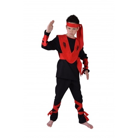 Ninja enfant comprenant le pantalon, la veste et le ruban rouge pour les cheveux.