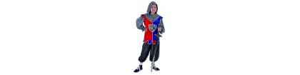 Déguisement chevalier comprenant le pantalon, la veste, la coiffe et la ceinture.